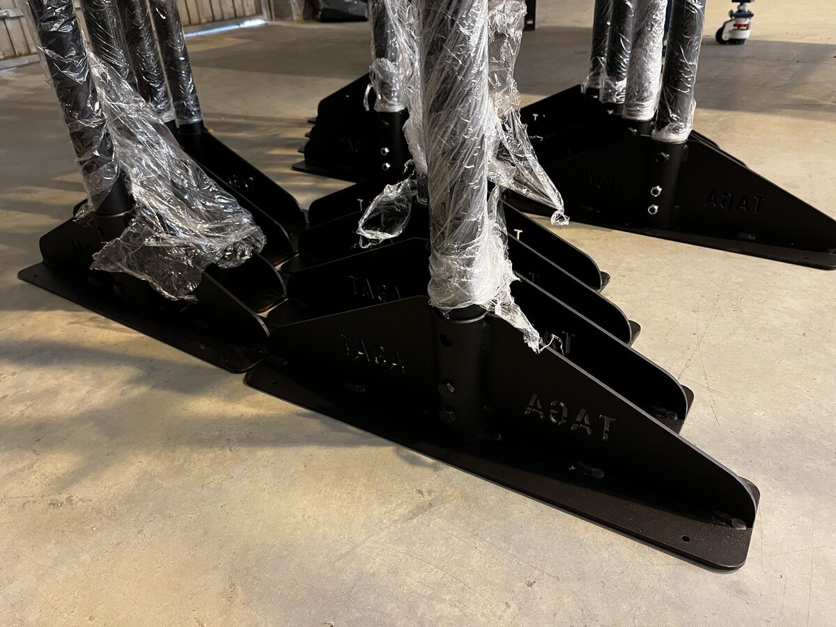 • Detachable base plates in structural steel grade S355J2+N, with options for floor anchoring or castor wheel integration.